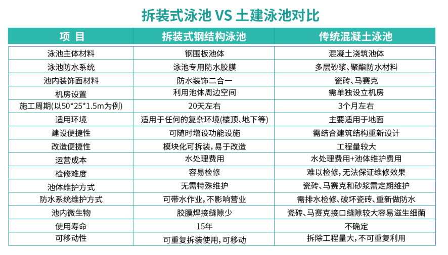 隨著傳統(tǒng)泳池逐漸不再能滿(mǎn)足人們的需求,越來(lái)越多的人開(kāi)始把目光轉(zhuǎn)向了拆裝式整體泳池上,對(duì)于用過(guò)經(jīng)營(yíng)者來(lái)說(shuō)拆裝式泳池確實(shí)比傳統(tǒng)的混凝十泳池更加堅(jiān)固安全!拆裝式泳池建造的過(guò)程中包含了設(shè)備安裝、膠膜焊接、管道預(yù)埋、池體安裝,拆裝式泳池的建造周期時(shí)間比較短,其中也包含一些十建工作,當(dāng)然有的泳池在樓頂上進(jìn)行安裝是不需要進(jìn)行進(jìn)行挖坑的,對(duì)一些健身房、水上樂(lè)園的經(jīng)營(yíng)者,想要在短時(shí)間內(nèi)完工并投入正常是營(yíng)業(yè)當(dāng)中就不得不考慮拆裝式泳池了,同時(shí)日后的維護(hù)也是非常簡(jiǎn)單的。