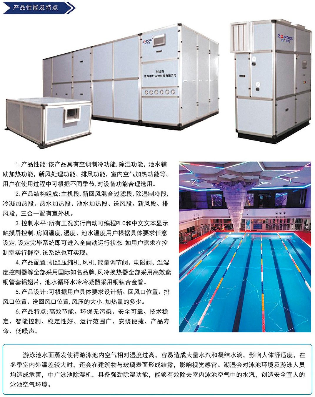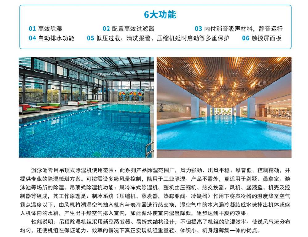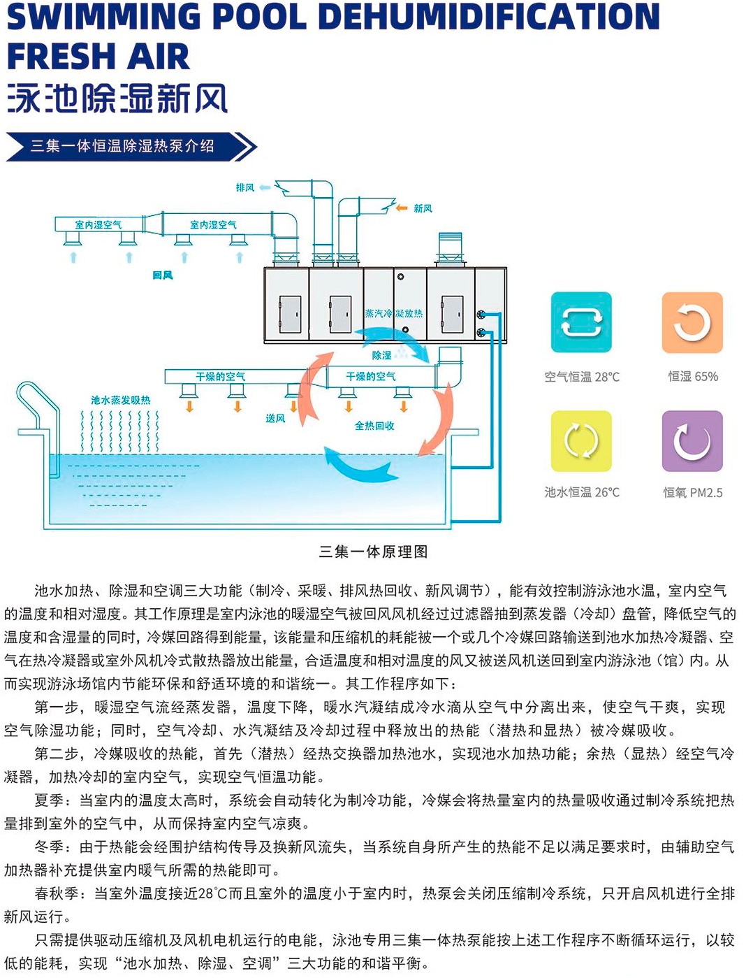 三集一體除濕熱泵,是指具有:泳池水熱水、泳池室空氣除濕、室內(nèi)空調(diào)三樣功能集一體的熱泵,該熱泵一般還具有,新風排風功能,熱回收功能,因此也有人叫它五集一體。